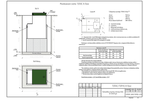 Топас 8 Лонг является самотечным, значит, очищенная вода сливается по трубе под наклоном в сторону точки сброса. Устанавливают его при наличии дренажного колодца, глубокого оврага, поля фильтрации, где вода уходит в грунт и не застаивается.